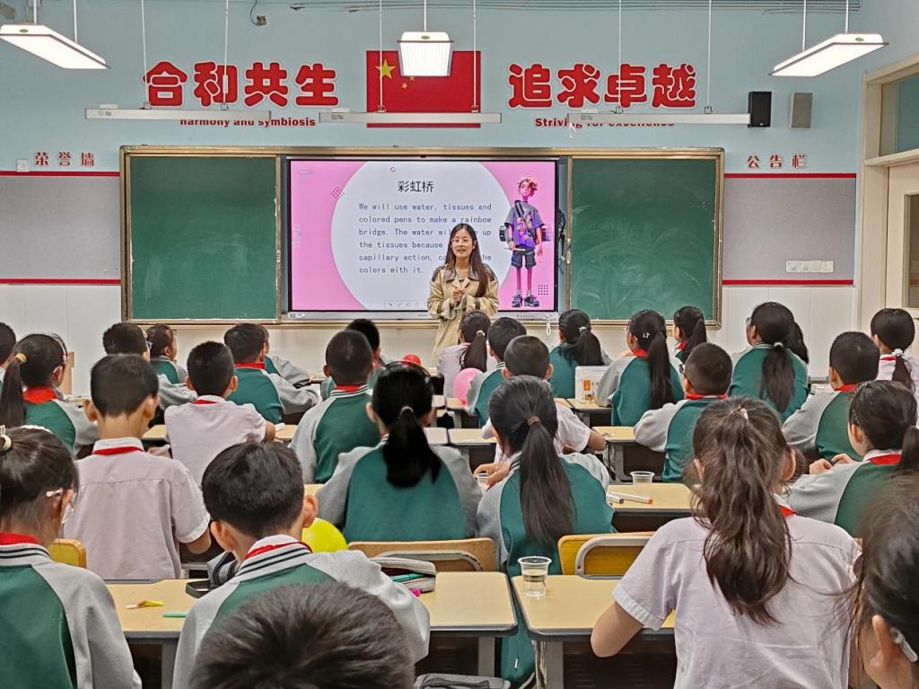 活动现场,志愿者先用英语介绍了科学的重要性,并鼓励学生们用英语介绍自己,表达自己对科学的理解。随后,志愿者们带领学生们分组进行了三项趣味科学实验演示,气球摩擦起电、自制彩虹桥和会跳舞的盐实验。进行过程中,每个小组都积极与志愿者们交流有趣的实验现象,并尝试用英语来解释实验原理。在一片欢声笑语中,学生们不仅学习了科学知识,还通过英语角的互动环节,锻炼了英语口语表达能力。