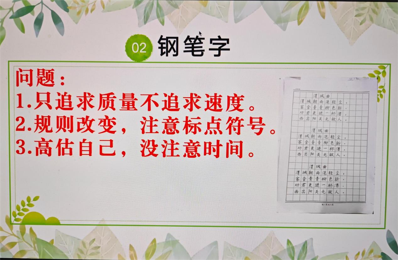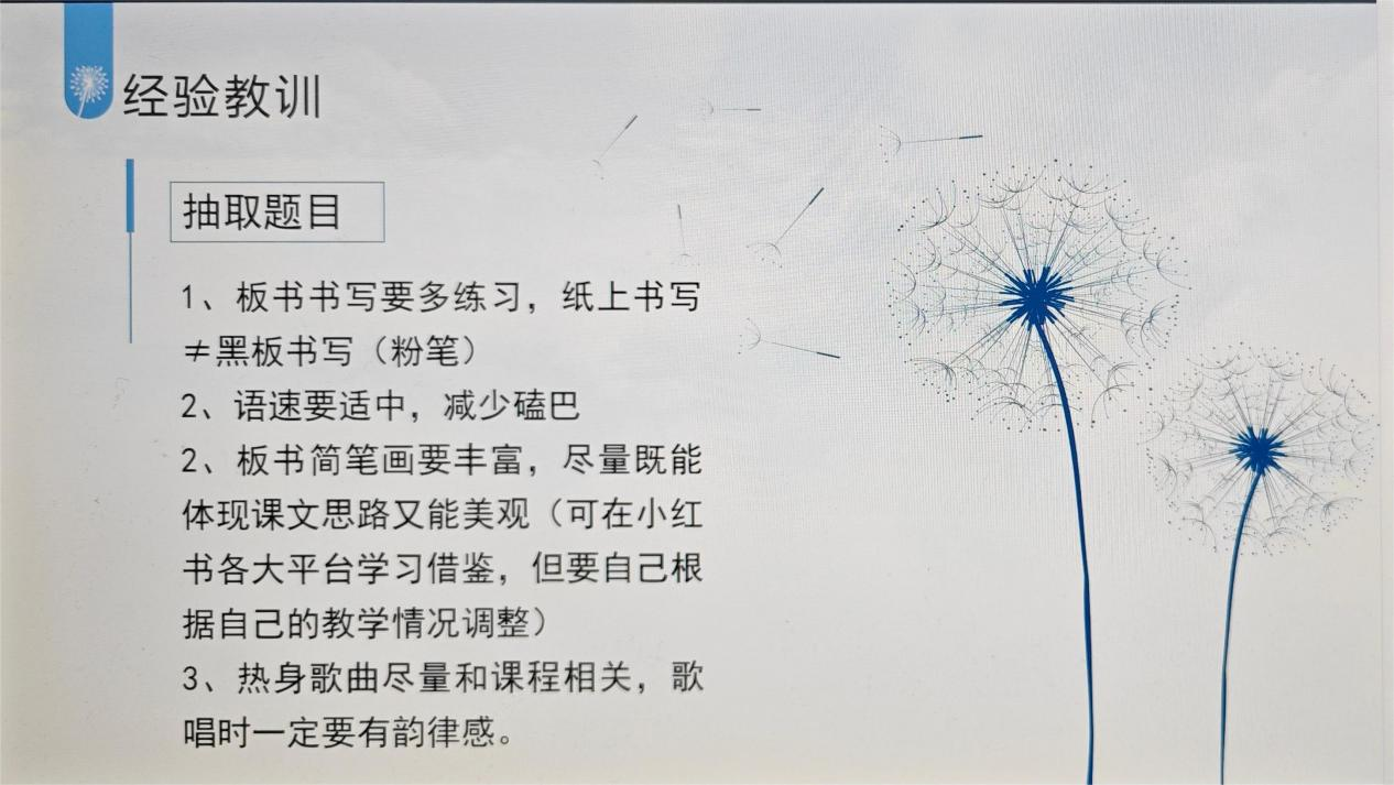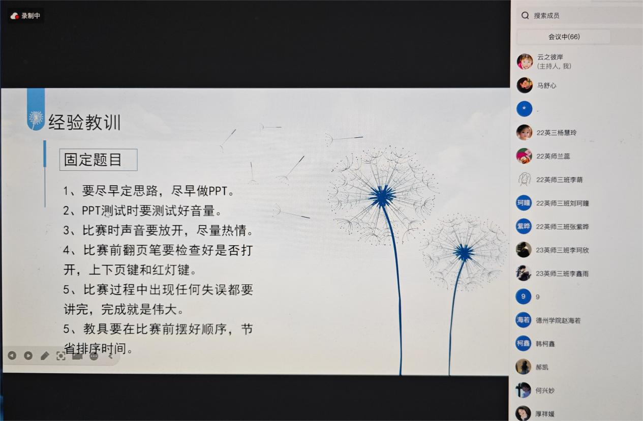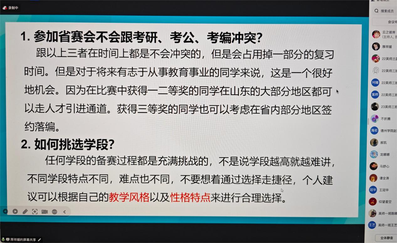 荣获一等奖的选手马舒心同学介绍了山东省师范类高校学生从业技能大赛中抽取组的比赛安排以及自己的备赛过程,并从固定题目、抽取题目的准备、钢笔字与答辩的练习、服装的准备方面总结了自己的经验体会。二等奖获得者郝凯同学介绍了推荐组的选拔情况以及自己的备赛过程,并分享了固定题目准备与课件制作、钢笔字练习注意事项等内容。两位同学还强调了备赛和比赛中心理调节与心理建设的重要性。三等奖获得者厚祥媛同学分享了个人的院赛和校赛经历,提供了高中英语的备赛建议等内容,并围绕备赛中的常见问题进行解答。