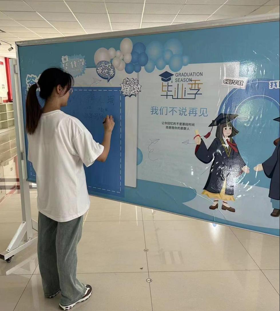 活动过程中,毕业生们纷纷在签名墙前用笔与镜头“花式”见证自己的毕业时刻,与老师同学合影,留下珍贵的回忆。毕业生们在签字板前驻足,签下自己的名字,这不仅仅是一种纪念方式,更是对未来的承诺和期待。同时,签名也是一份对自己的鼓励和鞭策,让大家在未来的日子里不断努力、追求卓越。签字板上的字字句句都是同学们真挚情感的流露。