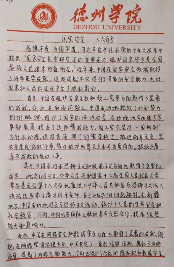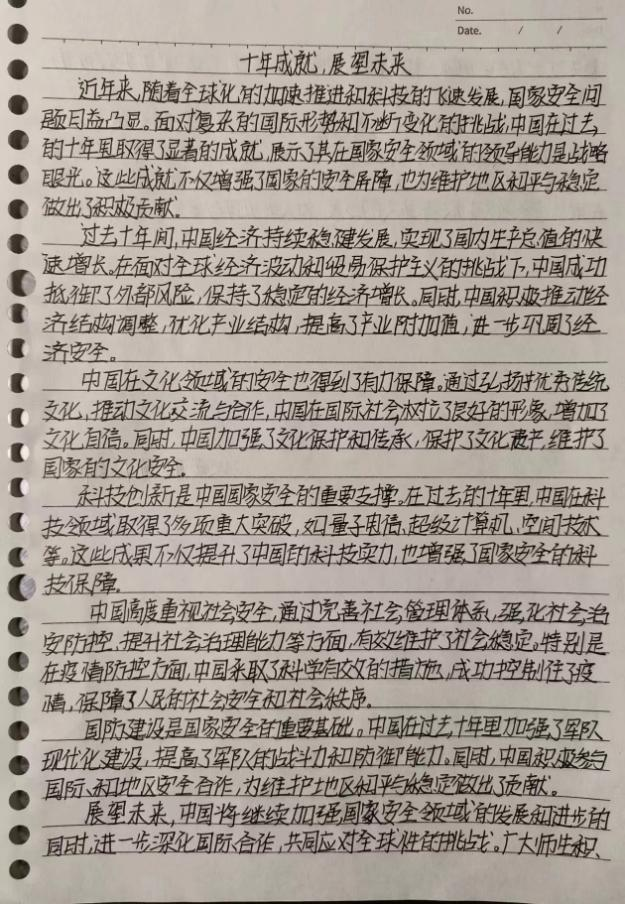 同学们结合自身的学习体会和深刻感悟,紧密围绕“守国家安全,护万家安宁”的核心主题,积极主动地搜集各类相关资料,以记叙或议论的形式,全方位、多角度地探讨了对国家安全的理解,并表达了维护国家安全的坚定信念,以真挚的情感歌颂了青春的美好,展现了他们对于“守国家安全,护万家安宁”的执着追求与坚定信念。