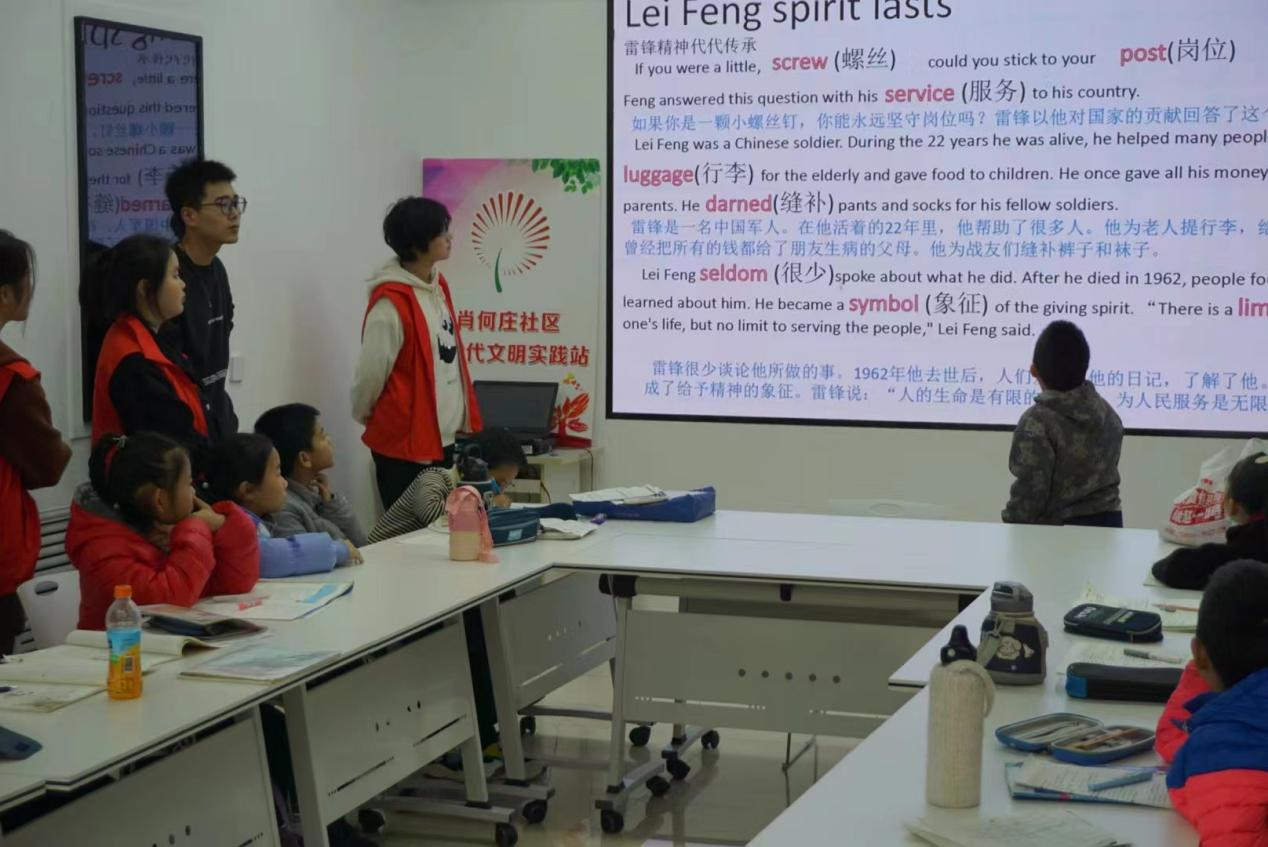英语角课堂中,志愿者们带领小朋友们阅读学习,锻炼学生们英文读写能力,通过汉英对照,带领小朋友们对英语词句进行翻译,让小朋友们在活动过程中体会到英语学习的广泛性与趣味性。随后,通过观看短片,使小朋友们对雷锋的故事有了更加深刻的认识。
