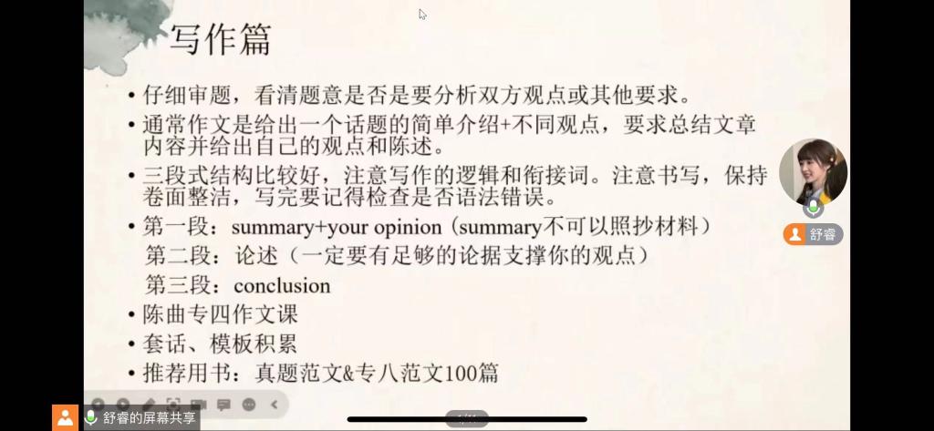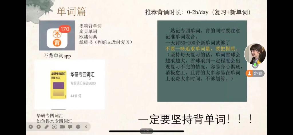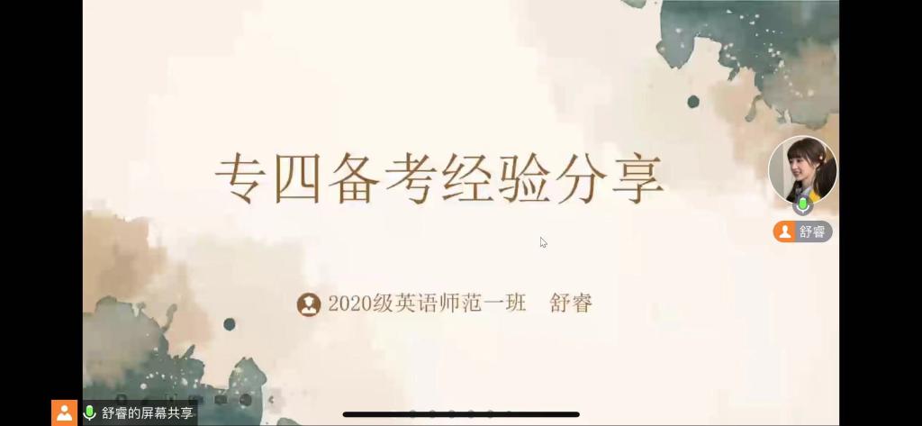 舒睿同学多维度向同学们深入剖析,从听力、阅读理解、词汇、语法等方面分享自己的备考经验和心得,讲述了不同阶段的学习情况与技巧,介绍了从准备阶段到应试阶段,听力、词汇、语法、作文及阅读部分的考点难点及考试注意事项,并分享了诸多有益的学习经验,比如使用学习软件提高自身听力水平,学会循序渐进;勤于练习,贵在坚持;注重词汇积累,把功夫花在平时,充分利用专业书籍,形成有效的学习方法;锻炼思辨能力,在写作中灵活应用等。