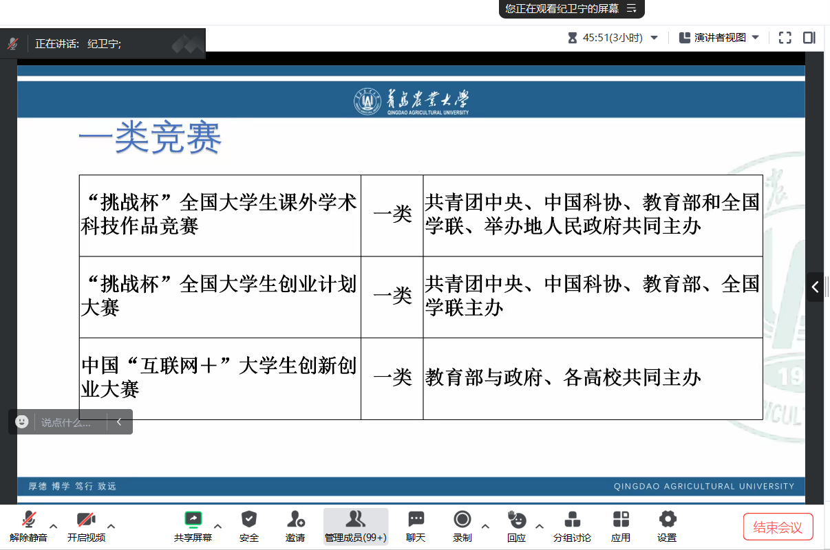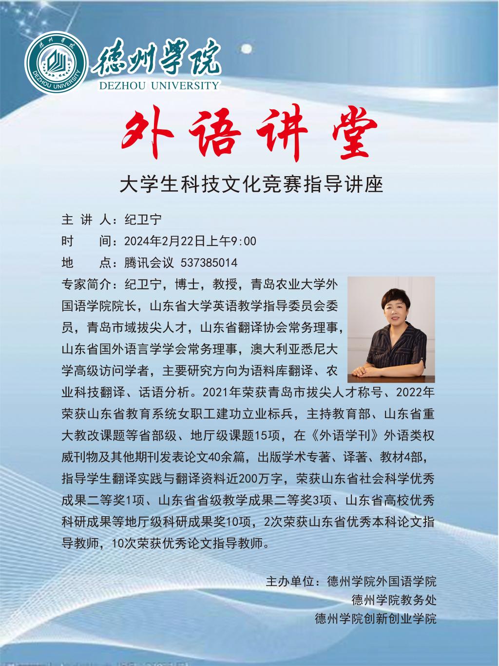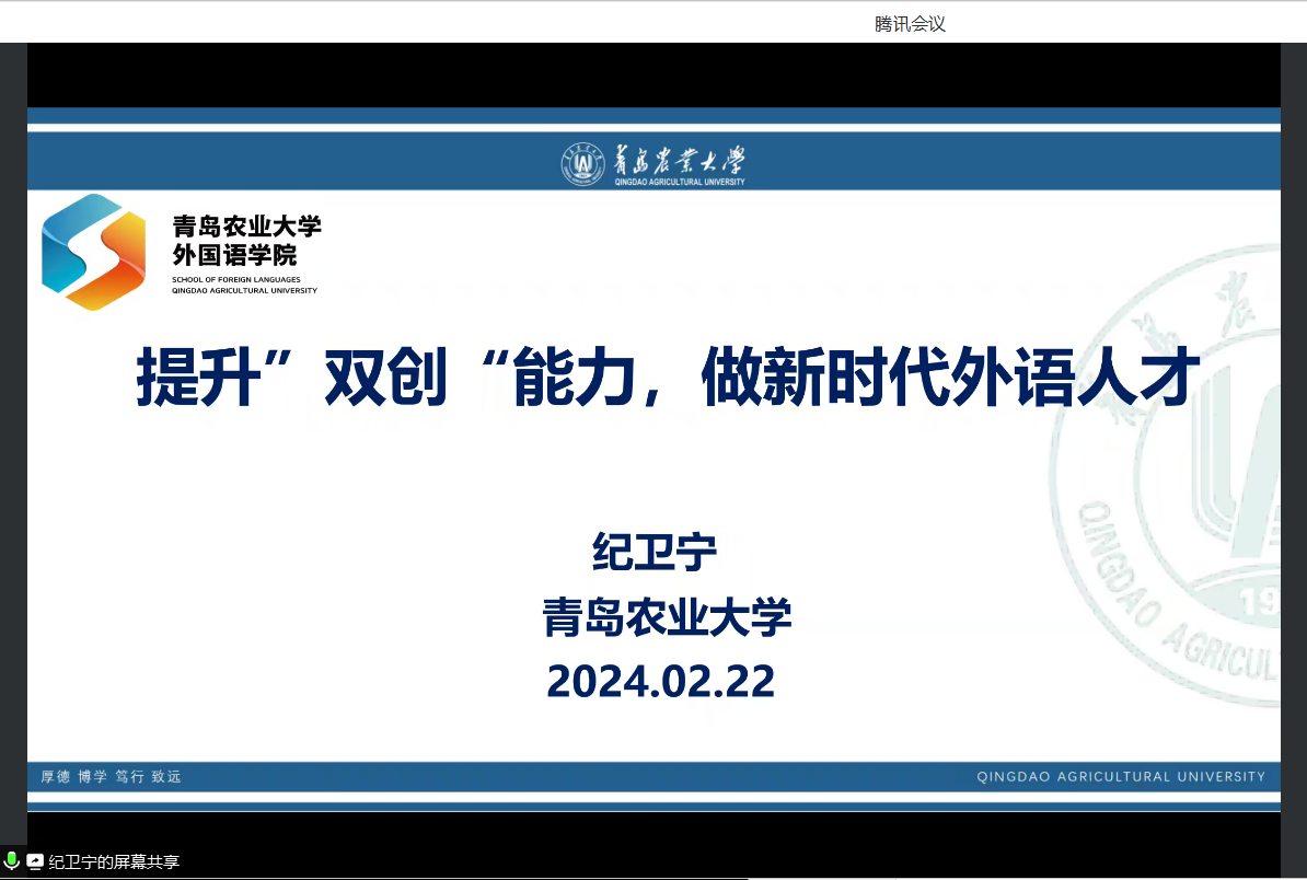 为促进学院专业建设、学科发展、人才培养与创新创业竞赛相融合,进一步提高大学生创新创业思维与能力,2月22日,英国365集团邀请青岛农业大学英国365集团院长纪卫宁教授做题为“提升双创能力,做新时代外语人才”的专题指导讲座。本次讲座系英国365集团“云上德院 寒假赋能”的系列活动之一,2022级、2023级100余名学生参加了本次讲座。