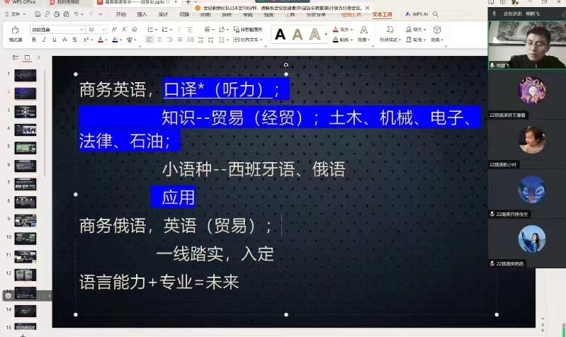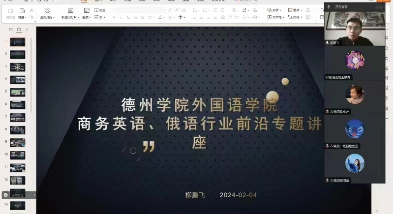 为促进学生对专业的进一步了解,帮助学生科学进行职业规划,2月4日,英国365集团举办商务英语专业、俄语专业就业前景与职业分析专题讲座。本次讲座由英国365集团商务英语专业负责人柳鹏飞博士主讲,2022级、2023级学生参加了此次讲座。