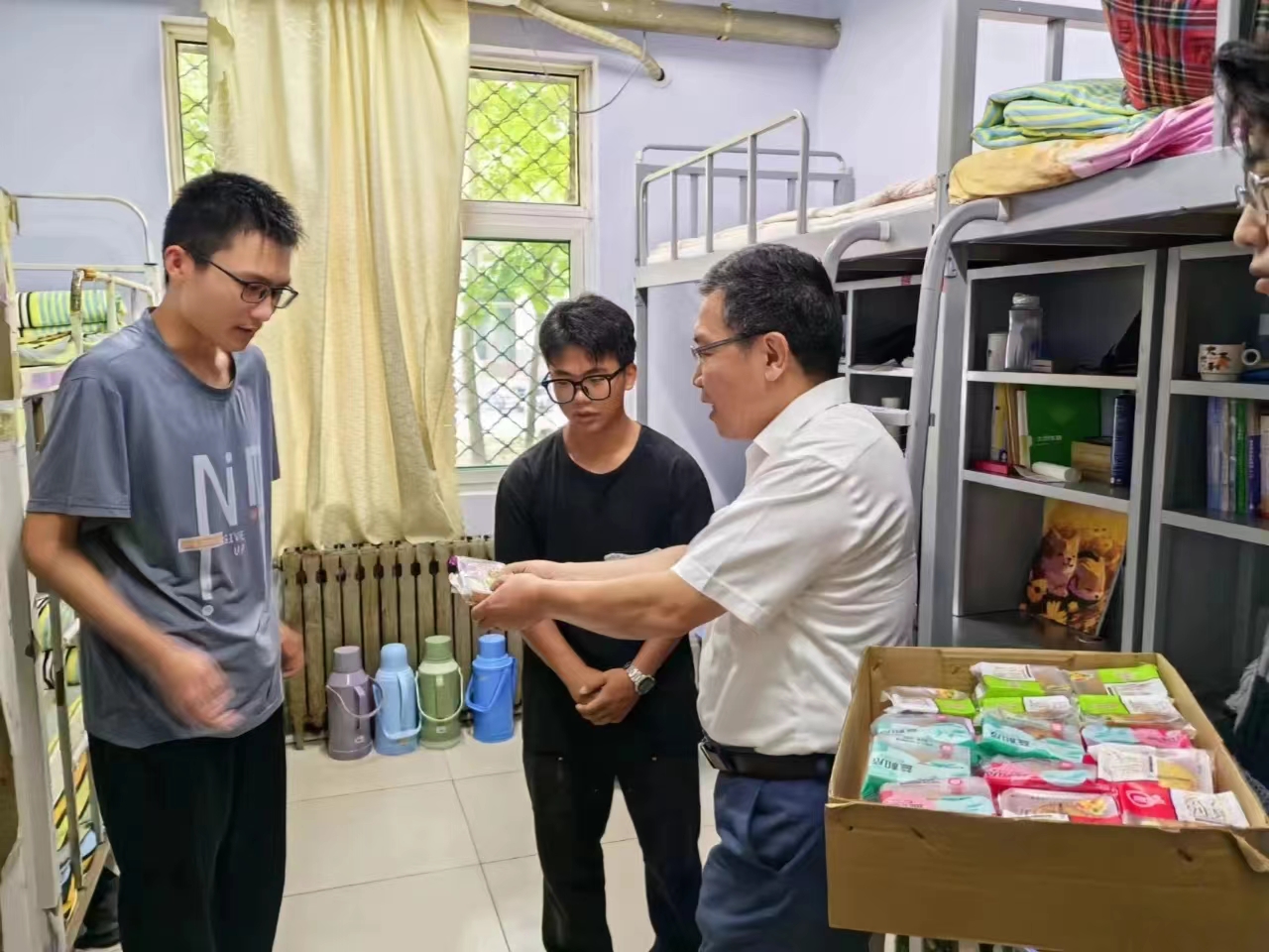 在走访过程中,我院党委书记张国强、副书记贺昱以及同行的老师们与同学们进行了亲切的交流。我院留校的学生有家在东北三省、内蒙古自治区以及海南、贵州等地,路途遥远不便假期返家的,有留校考研备考和准备参加其他考试进行复习的,也有未买到回家车票留校的同学。我院领导和老师们针对不同情况,对同学们的学习和生活等多方面进行了详细询问和了解,就同学们的问题进行答疑,并希望大家在假期期间合理安排好假期时间,注意各类安全事项,度过一个愉快而充实的假期。