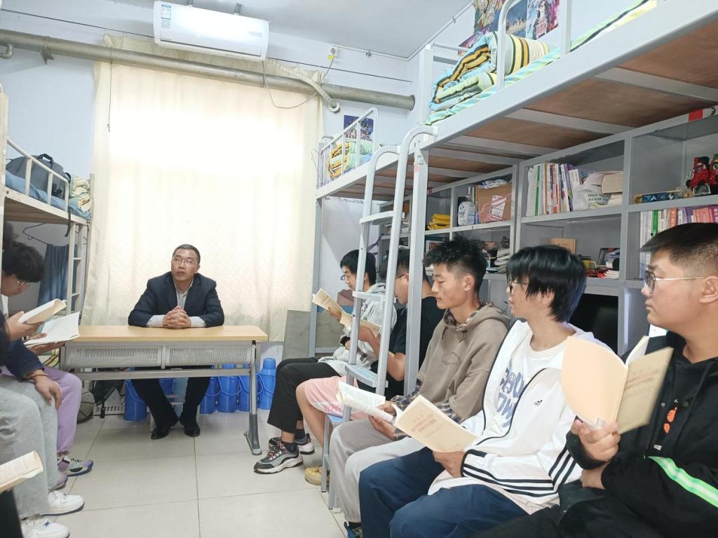 根据学校学习贯彻习近平新时代中国特色社会主义思想主题教育和在全校大兴调查研究的实施方案部署安排,5月16日晚上,党委书记张国强深入学生宿舍,通过座谈会的形式为同学们讲授党课。辅导员张强及2022级积极分子代表参加。