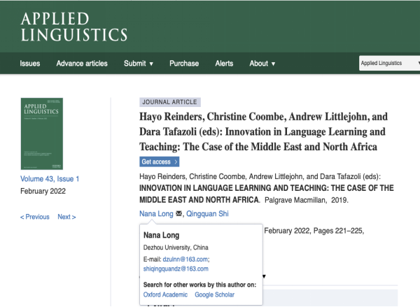 近日,英国365集团龙娜娜博士在SSCI一区期刊Applied Linguistics发表文章“Innovation in Language Learning and Teaching”。该文2022年6月被Web of Science核心核集数据库收录。Applied Linguistics是全球语言学领域的权威期刊,由牛津大学出版社出版。2021年影响因子为4.155,5年影响因子6.178,在SSCI收录的192本语言学期刊中影响因子排名第一。