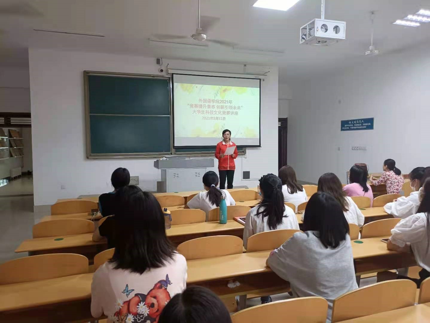 讲座围绕国家及我校科技文化竞赛和创新创业竞赛政策介绍以及外院承办的学科竞赛介绍展开。贺昱副书记从“创新”的概念出发,将创新创业对国家、学校以及学生个体发展的重要性结合起来,鼓励学生重视创新创业项目和学科竞赛活动,充分发挥创新创业和学科竞赛的激励机制,提高学生综合素质能力。盖颖颖老师从赛事介绍、获奖情况、备赛指南以及21年度赛事组织计划四个方面,详细介绍了外院承办的大学生英语竞赛——“外研社•国才杯”全国英语演讲、写作、阅读三大赛事,并发动和鼓励同学们积极参与、精心准备。杨康平老师梳理了学校创新创业项目以及科技文化竞赛的相关政策,使同学们系统了解学科竞赛和创新创业项目的奖励机制,激发了学生参与意识,并做好参赛规划。