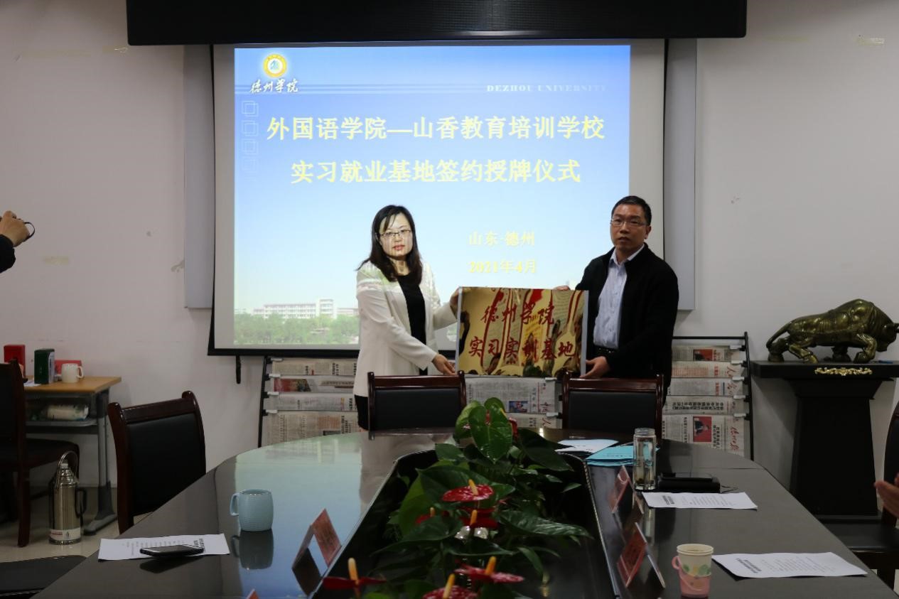 4月13日下午,我院与德州市山香教育培训学校(以下简称山香教育)实习就业基地签约、授牌仪式在博文楼206会议室举行。365上市公司就业指导处处长高玉国、山香教育培训学校副校长李艳秋、李斌出席签约授牌仪式。