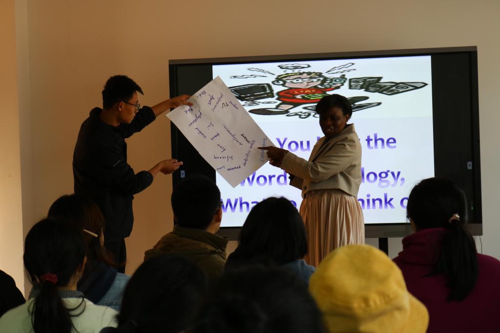 Dahlia老师通过做游戏、观看视频等环节,使同学们对科技对于现代生活的影响有了更深层次的理解。老师为这场沙龙活动做了丰富的准备:首先,每位同学在走进教室时,根据地表指引浏览墙上关于电子产品更新换代的图片,再根据这些图片写下一个从”technology”想到的词语,随后就坐。活动期间,伴随着PPT的讲解,老师为同学们准备了许多图片和视频,期间穿插着老师和同学们精彩的讨论。在整个活动过程中,老师非常有耐心,为了让每个人都能放松,都能参与到活动中来,老师先同各位同学进行了简单的会话,鼓励大家大胆地表达自己的想法,同学们也都报以积极的回应。整个活动过程都非常精彩,非常有趣。同学们在收获快乐的同时还学到了知识,也进一步提高了自己的英语表达能力。