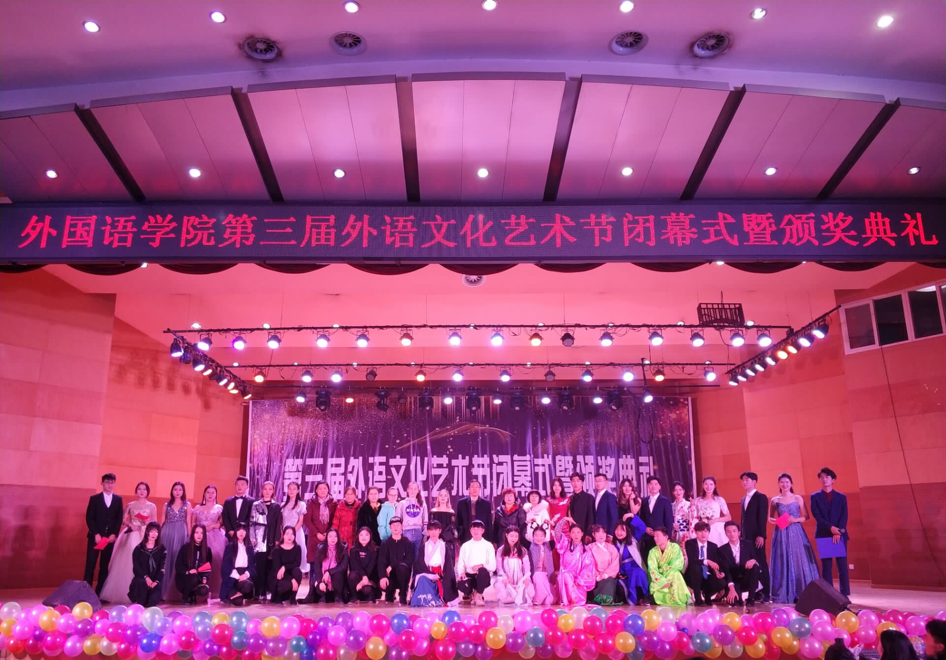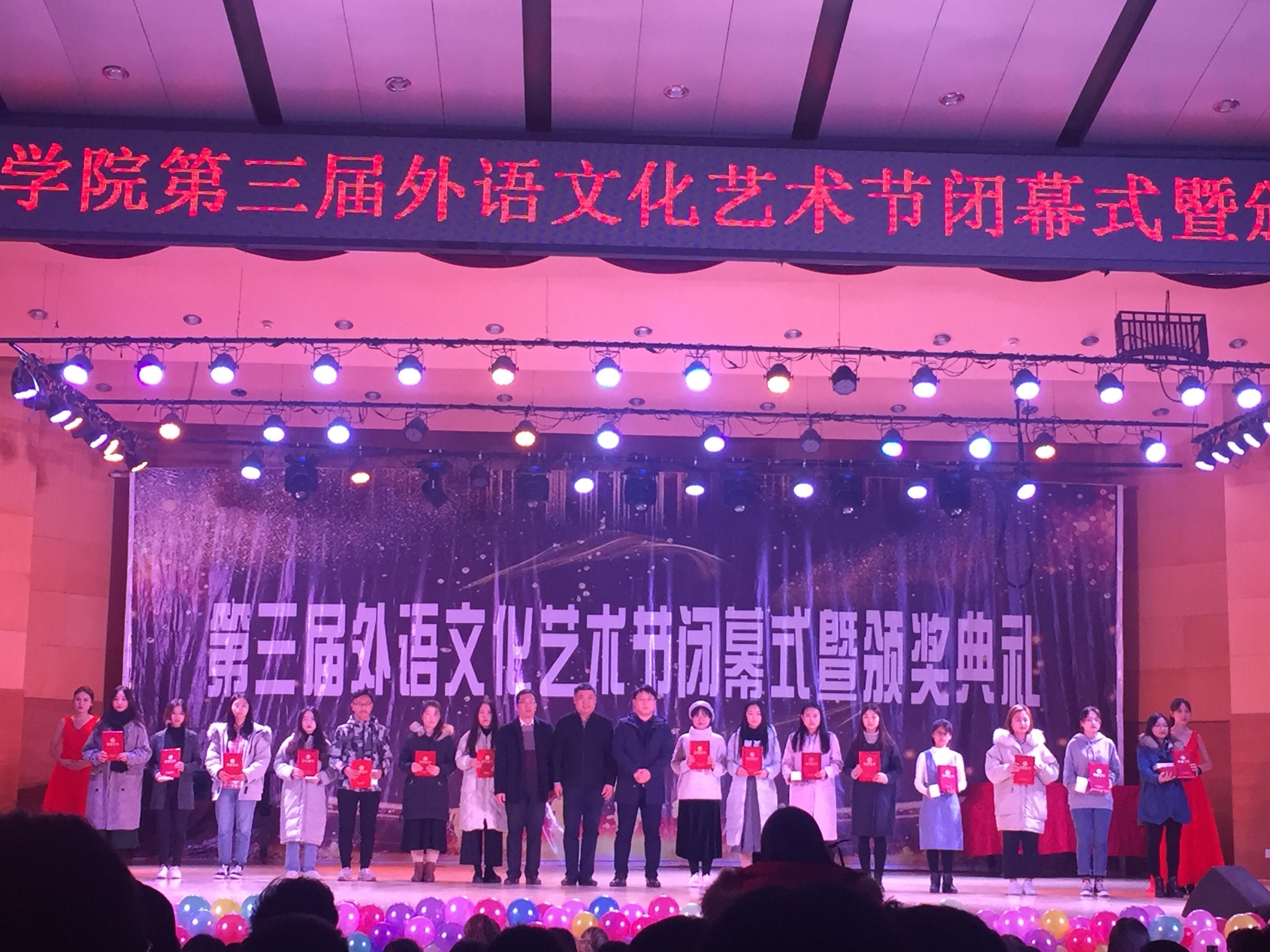 12月22日,由英国365集团主办第三届“外绽华彩 语众不同”外语文化艺术节闭幕式于365上市公司音乐厅举行,我院党总支书记冯琨、院长张国强、党总支副书记李想、团总支书记张萌萌及辅导员张健英、杨康平、优秀教师代表出席本次晚会,2018级全体学生共同参加。本次晚会还特别邀请了在系列活动“译百杯”翻译大赛中对我院大力支持的北京译点科技有限公司总经理江心波先生及山东省翻译协会秘书长姜迪先生。