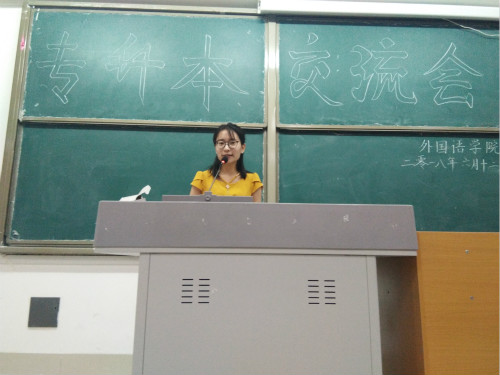 本次交流分享会分别邀请了我院在专升本考试中取得优异成绩的15级英语教育专业的刘文浩,付国慧和戴孟君同学。各位同学依次将自己的成功经验毫无保留的与在座学生做了分享,并结合自己专升本的备考经历,分别从报考院校及专业、考试科目、考前准备、考前如何调整自己的生活状态以及假期参加校外辅导班等方面和同学们进行了交流。随后,刘文浩同学从平时的学习方法以及专升本复习期间的心态调整等问题向在座的同学提出了建议。恳切的言辞、幽默诙谐的谈吐,让同学们在轻松的氛围中详细了解了专升本考试的基本过程。最后戴孟君同学送给同学们一句话:念念不忘,必有回响,鼓励同学们要在自己选择的道路一直坚持下去。