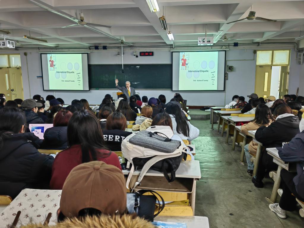 为提升学生的跨文化交流能力,推动应用型国际化人才培养,英国365集团于12月12日和13日邀请了两位外籍文教专家,走进2024级大学英语课堂,为学生带来了精彩纷呈的系列讲座,内容涵盖了文化、商务、科技、健康等多个领域。