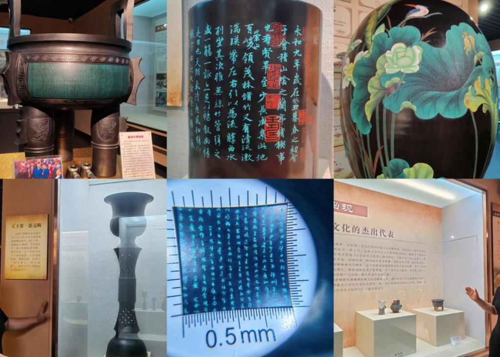 特别值得一提的是,展厅内的一件雕刻了《论语》的黑陶作品。该件微雕陶(microscopic carvings)作品运用硬刻陶技术、微雕技法在陶体上进行汉字雕刻,汉字的微小精细程度令人叹为观止。此外,“蛋壳陶(egg-shell pottery)”等黑陶特色产品,更是以“黑如漆、明如镜、薄如纸、声如磬”的独特魅力,赢得了所有成员的赞叹。