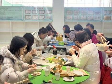 活动围绕10分钟即时擀皮、3分钟即时包水饺、水饺外观展示和集体活动展开。大家围在一起争先恐后各显身手,有的略显笨拙,有的轻车熟路,各式水饺花样百出,各方点评层出不穷。老师们在活动中切磋技艺、协同配合、畅所欲言,用饺子传递期许,用饺子传达情谊。现场气氛热烈而融洽。