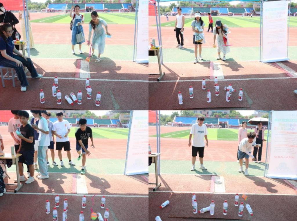 趣味活动围绕情绪管理和团队协作的主题展开。在“击破情绪,拥抱阳光”环节中,同学们将写有“焦虑”“迷茫”等负面情绪的标签的瓶子,用沙包击倒,直观感受压力释放的过程。同学们还主动创新活动玩法,如改变瓶子的摆放位置,把沙包当作保龄球,一击砸中多个,为游戏增添了新的活力。而在“神笔马良,妙笔生花”环节,则要求同学们抽取画画任务后,通过绳子末端控制笔,在三分钟内两人共同完成抽取内容,通过绳子控制笔的难度,让大家意识到沟通与合作的重要性,每一次笔尖的移动都需要队友间的默契与信任。此外还准备了活动小奖品,现场气氛活跃,同学们在趣味活动中获得了身心的放松。