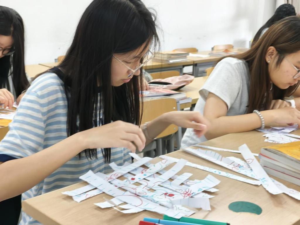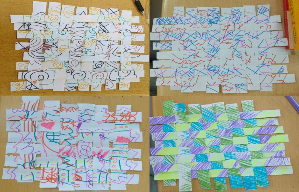活动分为“情绪绘画”“碎片重构”“分享感悟”三个环节。参与者首先在纸上绘制两幅画作,分别代表个人开心与难过的记忆,随后将画作剪裁成碎片,通过编织手法将不同情绪片段重新组合为一件完整的艺术作品。在创作过程中,同学们根据自己的内心感受和创意灵感,进行画作重构,用色彩和线条传递内心的情感表达。在分享介绍环节,有人则选择用柔和的色调和简约的构图来展现内心的平静与安宁。有人以几何图形隐喻成长中的矛盾与和解。每一件作品都代表着同学们情绪的起伏与变化,承载着一份独特的情感。