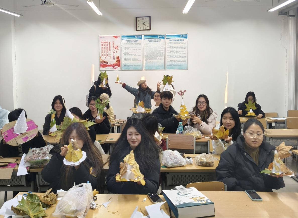活动以树叶、纸壳为原材料,融合自然之美与创意之趣。主持人演示落叶拼贴、彩绘、组合造型等基础技巧,并强调户外收集落叶时的安全注意事项。在创作过程中,大家充分发挥想象力与创造力,将收集的银杏、枫叶、梧桐叶等通过拼贴、裁剪、组合等方式,使秋日落叶的自然纹理与个性化创意相结合,创作出一幅幅精美作品,通过作品表达对自然之美的珍视。在分享交流环节,同学们从植物的脉络中感受到生命的坚韧,在刻画过程中体验到压力的释放,在色彩搭配中领悟到情绪的调节。这些承载着个人情感的作品不仅展现了同学们的创造力,更成为情感表达的有效载体。