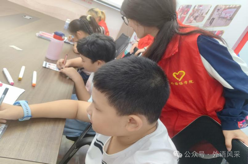 活动前期,志愿者团队结合儿童认知特点准备了情绪主题单词卡、奖励贴纸等教学物料;活动正式开始后,志愿者以情绪主题英语动画片开场,借助片中卡通角色的表情与台词引导孩子们初步认知 “happy(开心)”“sad(难过)”“angry(生气)” 等基础情绪词汇、建立英语学习兴趣,进入单词教学环节后,志愿者使用印有表情插画与对应英语单词的 “情绪主题单词卡”,通过“绘画+英语”联动教学法,先示范绘画“smile(微笑)”“cry(哭泣)”“laugh(大笑)”等表情并同步朗读单词,再邀请孩子们参与绘画并结合画作讲解词汇含义以帮助理解单词与情绪的关联,随后开展的“表情猜猜猜”互动游戏中,孩子们以小组为单位根据志愿者出示的表情简笔画竞猜对应英语词汇,准确回答或积极参与的孩子可获贴纸奖励,进一步巩固所学内容。
