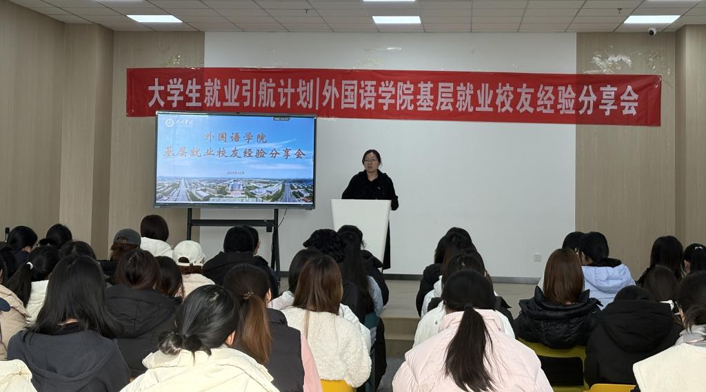 分享会上,刘玉伟以“乘风破浪,不负韶春”为题,结合自身赴新疆和田支教的实践经历与基层岗位备考的实战经验,从就业路径解析、备考技巧传授、基层工作感悟三个维度展开深度分享。针对英语专业的就业特性,他系统梳理了公务员(国考、省考、选调生)、教育类事业单位、文化传播机构等适配基层岗位的核心要求,详细解读了各类考试的时间节点、岗位设置及竞争态势。谈及基层工作价值,他说道,基层既是锤炼本领的“练兵场”,更是实现价值的“大舞台”,在参与民生实事的过程中,不仅能切实服务群众,更能明晰个人成长路径。