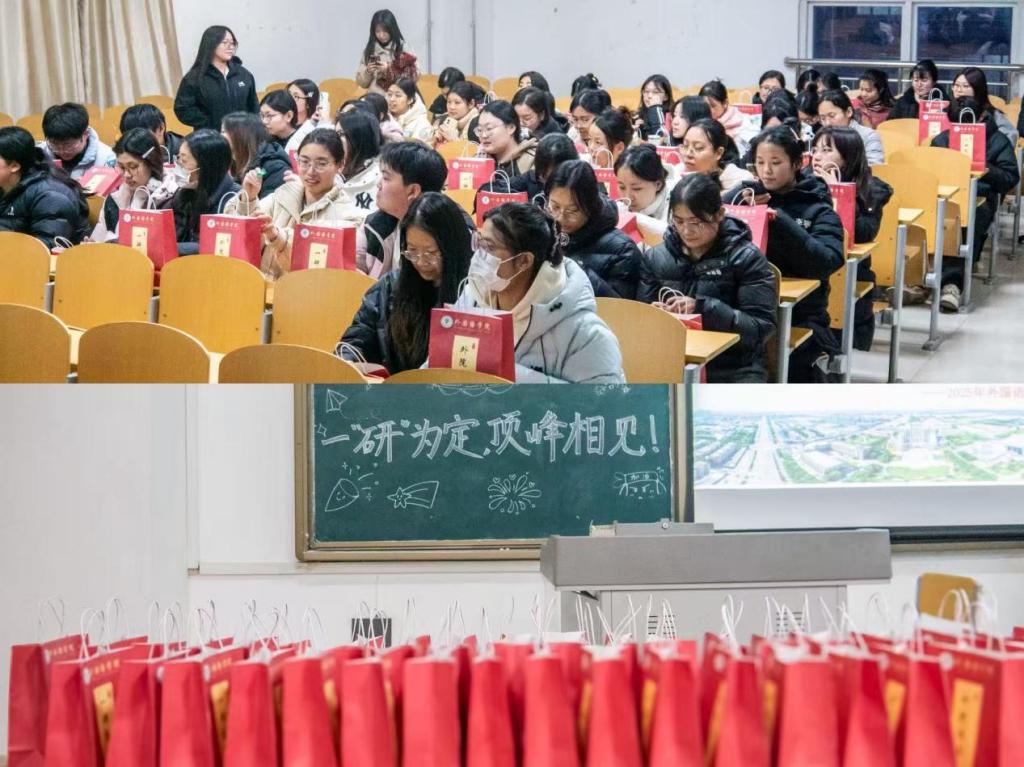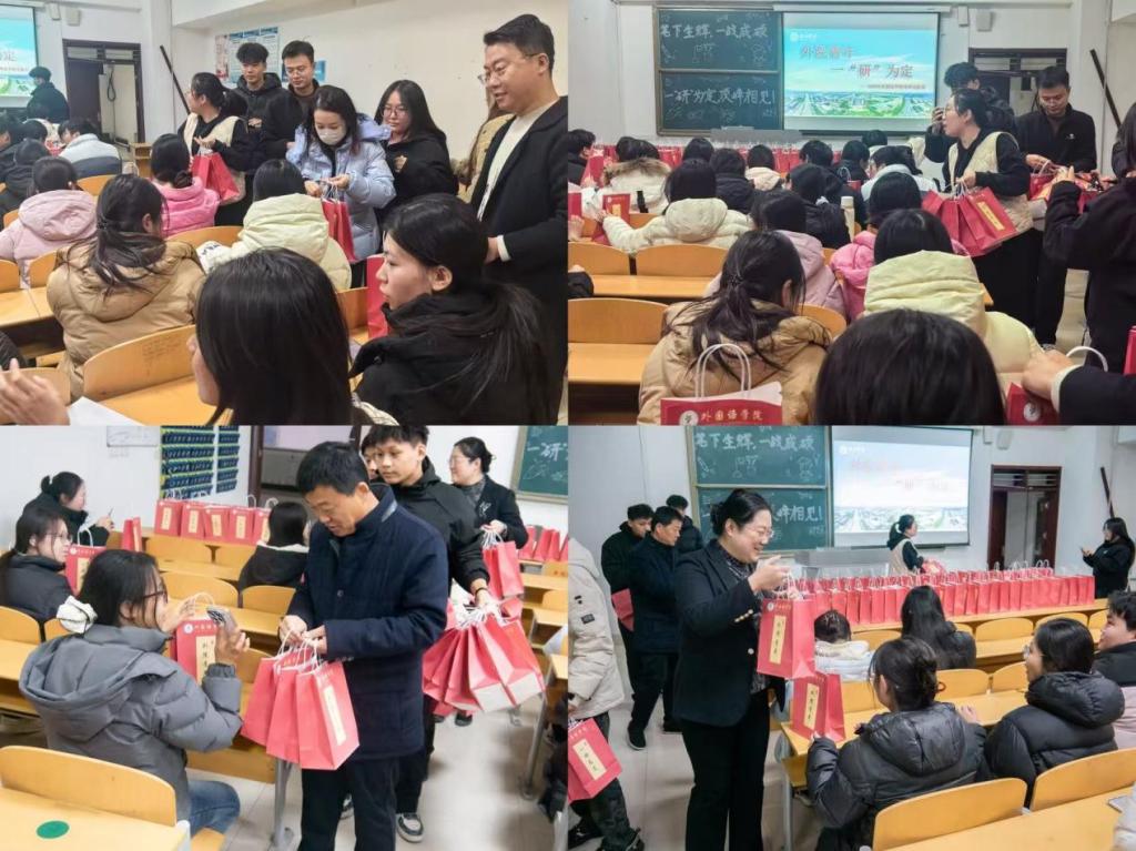 活动现场,张锦辉院长代表学院向全体考研学子致以最诚挚的慰问。她高度肯定了同学们在漫长且艰辛的备考路上所展现出的坚韧毅力与不懈拼搏精神,并悉心叮嘱大家,在冲刺的关键阶段,要进一步优化学习方法、保持高效复习节奏,以平稳从容的心态积极迎接即将到来的挑战。随后,孙红旗书记作总结发言,他着重强调,学院将始终如一地做好各项服务保障工作,为同学们的考研征程筑牢坚实后盾。同时,他建议同学们在最后阶段务必合理安排作息,保持良好的复习节奏,以最饱满的精神状态迎战考试,为个人未来发展与母校荣光增添新的光彩。此外,学院还特别为考研学子准备了寓意深长的“外院青年 一‘研’为定”暖心福袋,福袋内精心配备了暖贴、考试必备文具、计时器、励志糖果等物品,每一份礼物都承载着独特的美好寓意:暖贴“宝”你温暖、坚定前行;文具助你“具”细无遗、下笔有神;糖果为你补充能量、“果”然甜蜜,字里行间的祝福更愿为学子们加持好运。