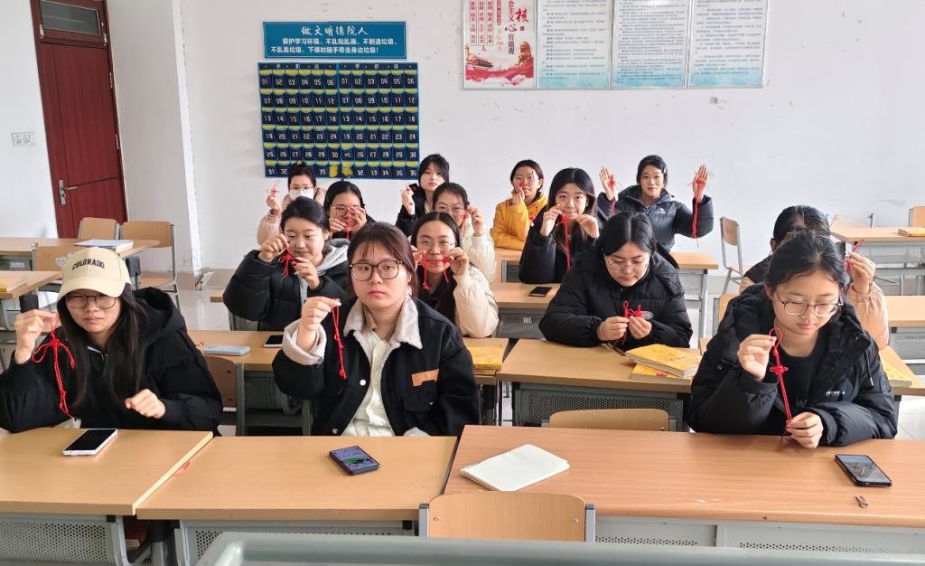 中国结历史悠久、种类丰富,蕴含了“团结、平安、吉祥”的千年文化内涵。主持人示范了基础结式的编织方法,平结、纽扣结、双钱结等逐一呈现。在编织过程中,同学们从最基本的“平结”学起,手中红丝线在指尖反复穿梭、拉紧。从最初的生疏到逐渐熟练,复杂的盘长结、喜庆的吉祥结在大家的编织下初具雏形。同学们不仅完成了基础的结式,还尝试将不同的结式结合起来,创作出具有个人特色的作品。这些作品不仅展示了同学们的创造力,也体现了中国结艺术的多样性和丰富性。
