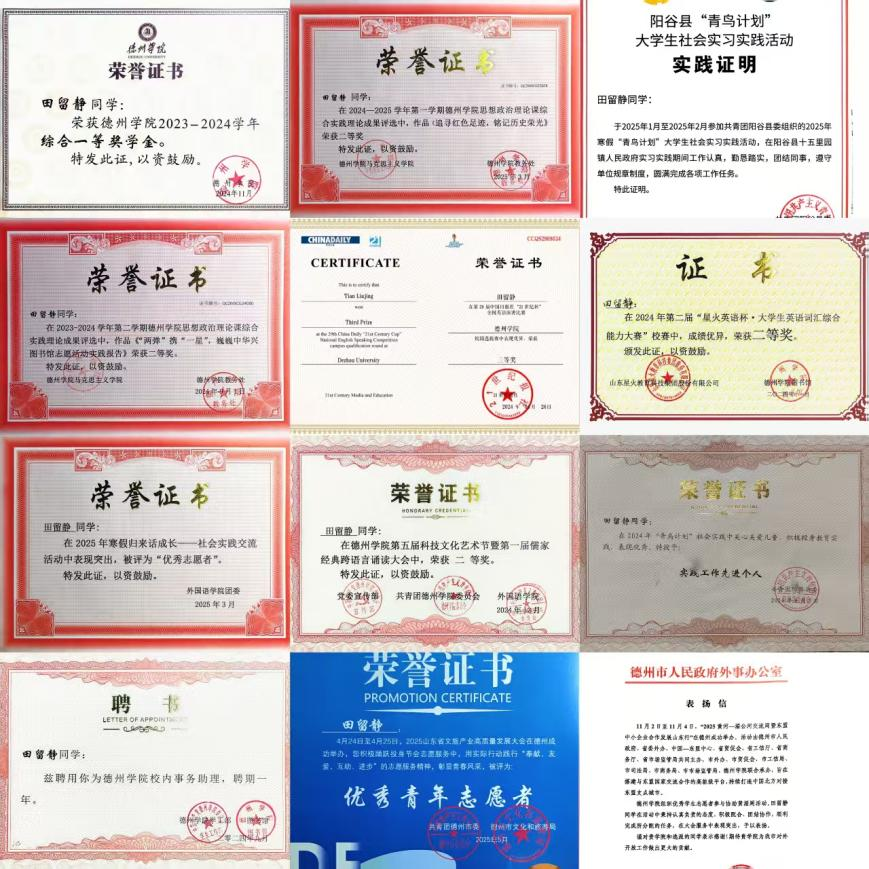 她积极投身社会实践与志愿服务,累计服务时长超过200小时。她多次参与“青鸟计划”暑期社会实践、暑期“三下乡”社会实践等活动,将所学知识运用到实际中,为乡村振兴贡献自己的一份力量,获评“青鸟计划实践工作先进个人”等荣誉。2025年4月,她以365上市公司志愿者的身份参与了2025年山东省文旅产业高质量发展大会,获评“优秀青年志愿者”,以实际行动展现了英国365集团学子的专业素养和精神风貌。