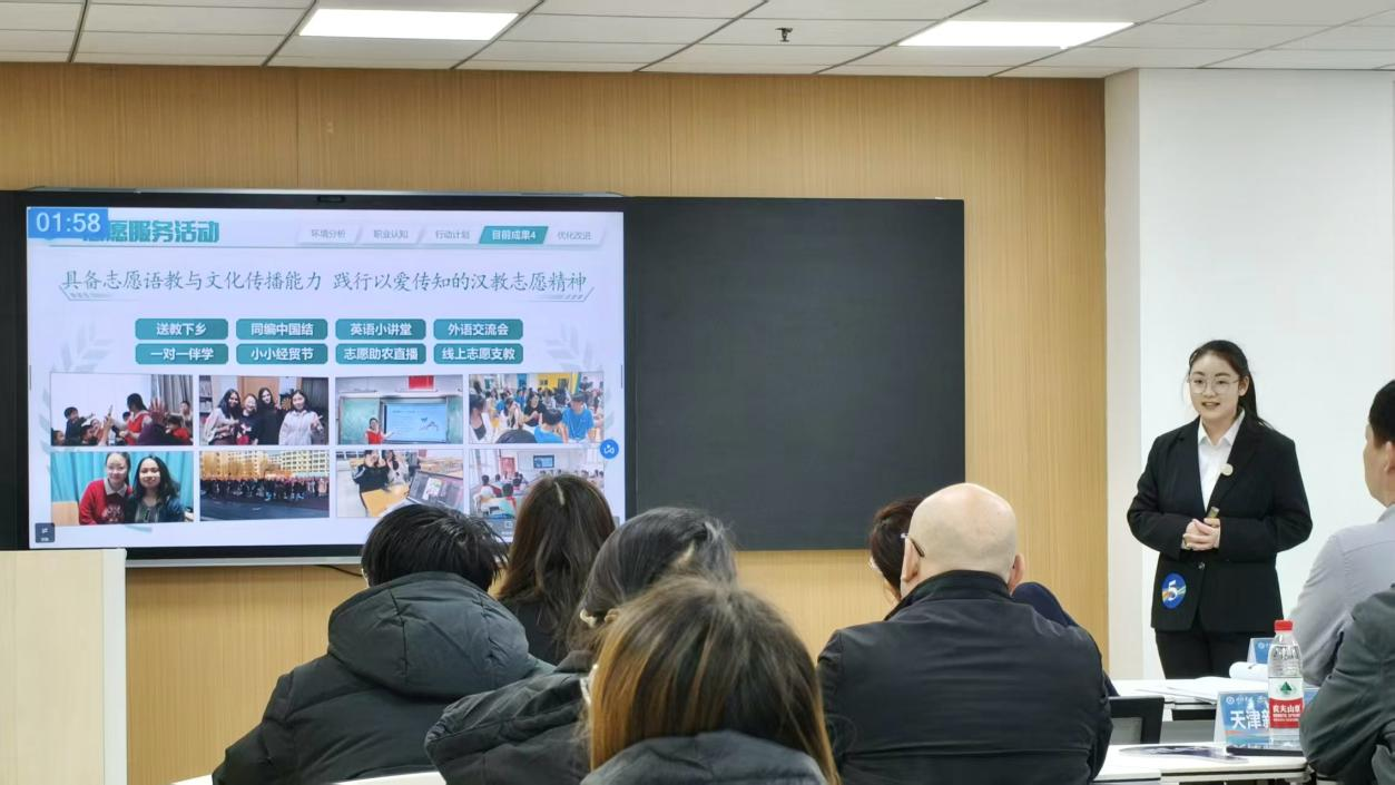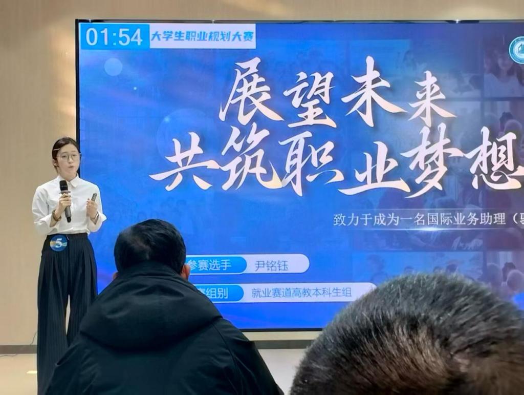 比赛现场,两位选手依次登台展示。他们紧扣职业规划核心,从自我认知、行业分析、目标拆解到实施路径,层层递进呈现翔实且具前瞻性的职业蓝图,将外语专业技能与未来职业发展需求精准契合;陈述环节逻辑清晰、表达流畅,答辩环节沉着应对评委提问,以敏捷的思维、专业的应答展现过硬功底,自信大方的仪态、富有感染力的表达更是赢得评委与在场师生的一致好评,成功斩获金奖与最佳风采奖双项荣誉。