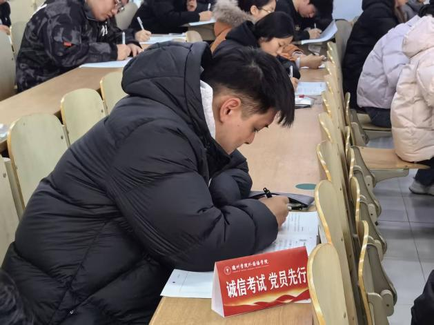 充分发挥学生党员在诚信应考中的先锋模范作用,学院组织开展“党员亮身份,诚信作表率”活动。全体学生党员积极响应,将印有“诚信考试 党员先行”字样的承诺桌牌置于座位醒目位置,主动亮明党员身份,自觉接受广大师生监督。这一举措不仅展现了学生党员以身作则、严于律己的自觉意识,更以可视化、常态化的形式,将党员的责任担当落实在考场一线,以实际行动带头维护考试纪律,树立了“一名党员就是一面诚信旗帜”的鲜明导向,进一步强化了诚信考试的氛围营造和价值引领。