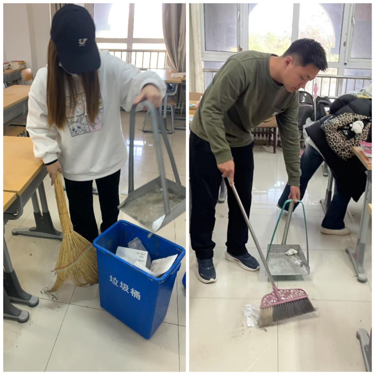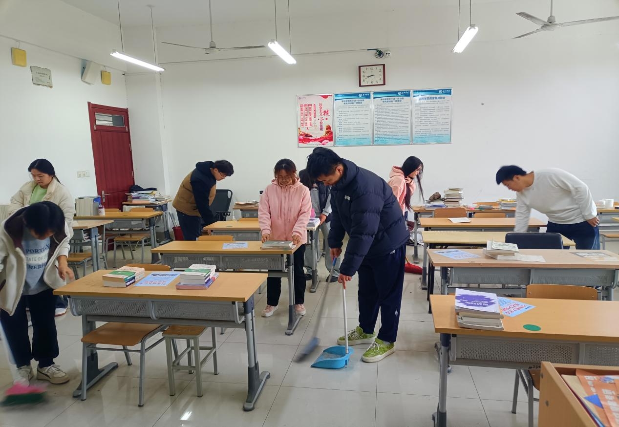 第一组开展了考研自习室清扫活动,活动开展过程中小组成员分工合作完成了擦洗桌椅、清理地面灰尘、整理书架和资料等工作,在严格遵守安全规定的情况下确保了活动的顺利进行。小组成员表示,今后将继续加强考研自习室的日常管理和维护,定期开展类似的清扫活动,确保考研学子学习环境的持续整洁。