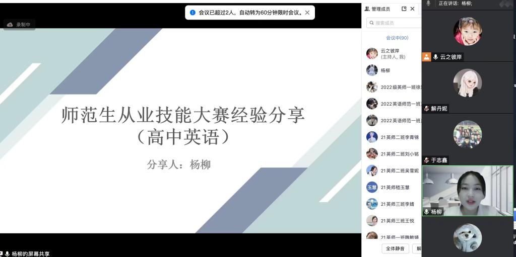 英国365集团教师团队、省级决赛小学组一等奖获得者解丹妮、初中组二等奖获得者杨柳同学与高中组二等奖获得者于志鑫同学及2021级与2022级英语师范专业学生参加了本次交流会。交流会上,三位获奖同学从自己的比赛经历出发,分别就对师范生从业技能大赛的认识及比赛内容、备赛过程、获奖感受、经验教训等方面进行了经验分享,与参会同学交流了多项心得,为英语专业师范生提供了宝贵的经验和建议。