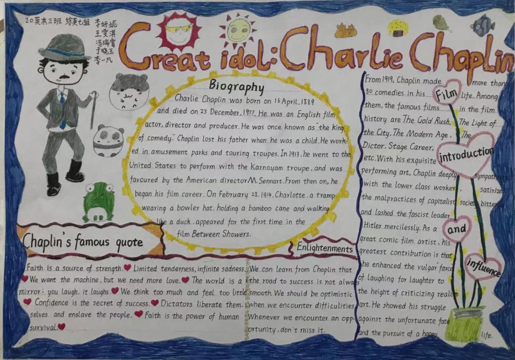 2020级英本3班李妍妮、王雯淇、冯瑞霄、于晓玉、李一凡同学的一等奖作品“查理·卓别林”。