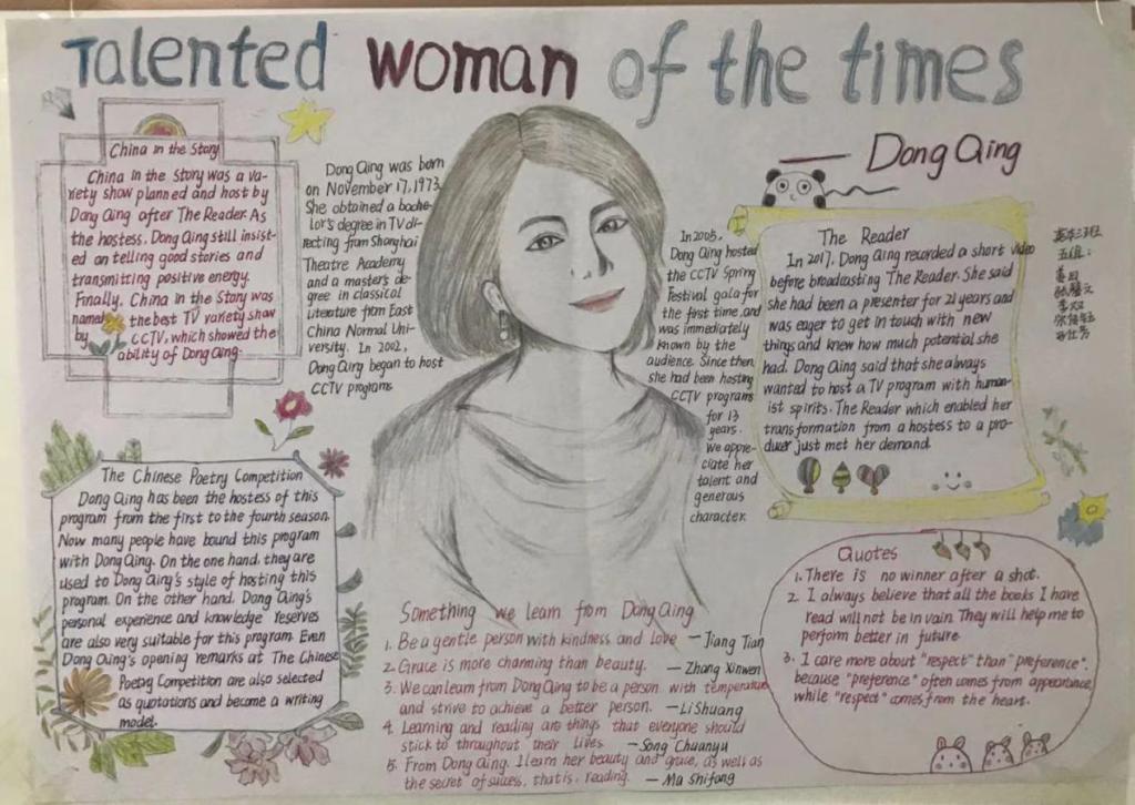 2020级英本3班姜田、张馨文、李双、宋传钰、马仕芳同学的一等奖作品“才女董卿”。