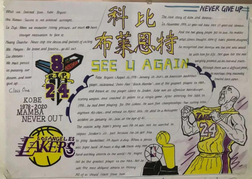 2020级英本1班鲁子怡、黄翘楚、侯晓微、马海岩、刘振伟同学的一等奖作品“科比•布莱恩特”。