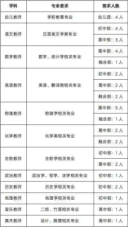 3.应聘融合部(原高中国际部)的英语教师,需取得英语专业八级证书或雅思 7.0 分以上或托福 100 分以上,具有海外学习经历或 A-level 课程教学经验者优先。
