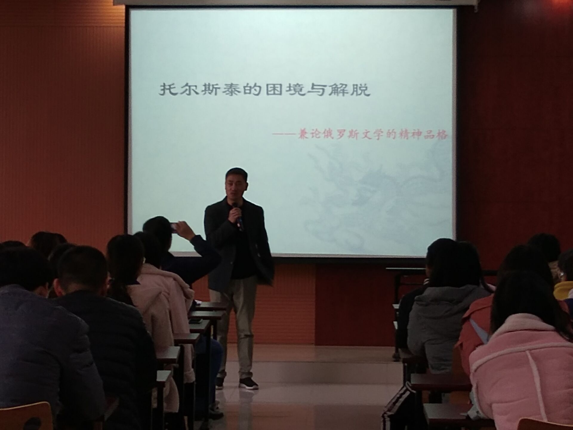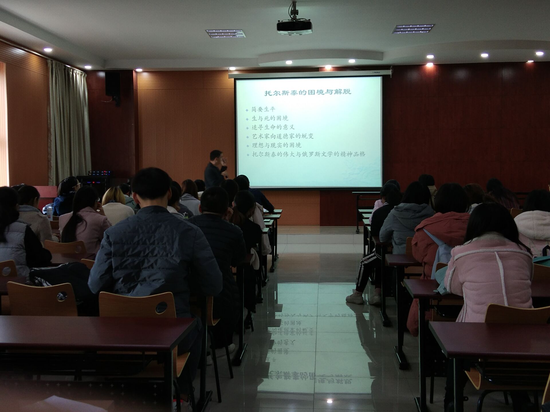 在此次报告中,王宗琥教授主要围绕托尔斯泰这一人物开展讲座。通过讲述托尔斯泰的生平经历,从托尔斯泰的种种困境再到解脱,再由其从艺术家蜕变为道德家,既让我院同学更加深入了解托尔斯泰,又能感悟俄罗斯的文学背景与成功的不易。